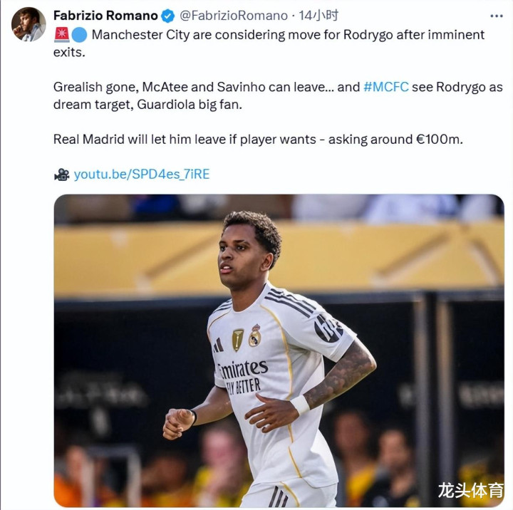 紧接着2025年8月11日晚8点19分,知名转会记者罗马诺爆料,曼城有意引进皇马巴西妖星罗德里戈,同时罗马诺还提到皇马为罗德里戈标价1亿欧元。套现两名年轻小将,无缝衔接一名即战力强当打之年的前锋,对于志在新赛季夺冠,干出一番大视野的曼城来说,毫无疑问是个非常合理的选择。